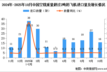 中商情报网讯:据中商产业研究院数据库显示,2025年10月中国空载重量超过2吨的飞机进口量16架,...【详情】