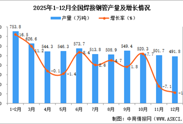 中商情报网讯:据中商产业研究院数据库,2025年12月全国焊接钢管当月产量与去年同期相比下降。2...【详情】