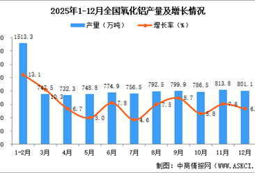 中商情报网讯:据中商产业研究院数据库,2025年12月全国氧化铝当月产量与去年同期相比增长。202...【详情】