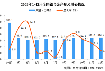中商情报网讯:据中商产业研究院数据库,2025年12月全国铁合金当月产量与去年同期相比增长。202...【详情】