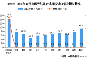 中商情报网讯:据中商产业研究院数据库显示,2025年12月中国天然及合成橡胶(包括胶乳)进口量95.3万吨,同比增长0.2%;1-12月我国天然及合成橡胶(包括胶乳)累计进口量8...【详情】