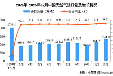 中商情报网讯:据中商产业研究院数据库显示,2025年12月中国天然气进口量1344.8万吨,同比增长0.2%;1-12月中国天然气进口量12786.5万吨,同比下降2.8%。 数据来源:中...【详情】