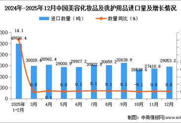 中商情报网讯:据中商产业研究院数据库显示,2025年12月中国美容化妆品及洗护用品进口量29053.2吨,同比增长持平;1-12月中国美容化妆品及洗护用品进口量348095.4吨,同比...【详情】