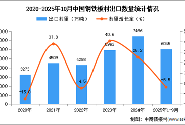 中商情报网讯:据中商产业研究院数据库显示,2024年中国钢铁板材出口量7466万吨,同比增长25.2%。最新数据显示,2025年1-10月中国钢铁板材出口量6045万吨,同比下降3.5%。...【详情】
