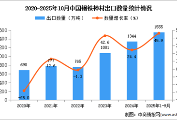 中商情报网讯:据中商产业研究院数据库显示,2024年中国钢铁棒材出口量1344万吨,同比增长24.4%。最新数据显示,2025年1-10月中国钢铁棒材出口量1555万吨,同比增长45.9%...【详情】
