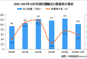 中商情报网讯:据中商产业研究院数据库显示,2024年我国柠檬酸出口量125万吨,同比增长6.2%。最新数据显示,2025年1-10月中国柠檬酸出口量103万吨,同比增长2.6%。 数据...【详情】