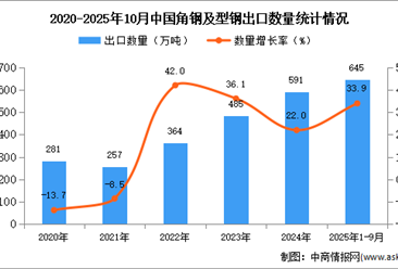 中商情报网讯:据中商产业研究院数据库显示,2024年中国角钢及型钢出口量591万吨,同比增长22%。最新数据显示,2025年1-10月中国角钢及型钢出口量645万吨,同比增长33.9%...【详情】