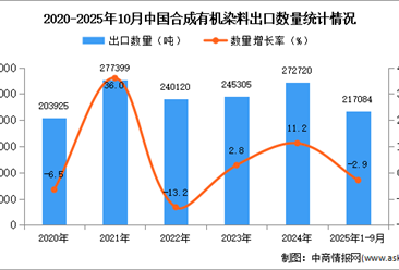 中商情报网讯:据中商产业研究院数据库显示,2024年我国合成有机染料出口量272720吨,同比增长11.2%。最新数据显示,2025年1-10月中国合成有机染料出口量217084吨,同比下...【详情】