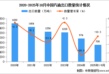 中商情报网讯:据中商产业研究院数据库显示,2024年我国汽油出口量974万吨,同比下降20.8。最新数据显示,2025年1-10月中国汽油出口量708万吨,同比下降10.3%。 数据来...【详情】