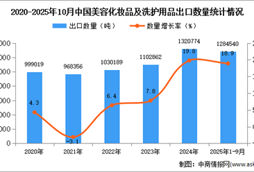 中商情报网讯:据中商产业研究院数据库显示,2024年我国美容化妆品及洗护用品出口量1320774吨,同比增长19.8%。最新数据显示,2025年1-10月中国美容化妆品及洗护用品出口...【详情】