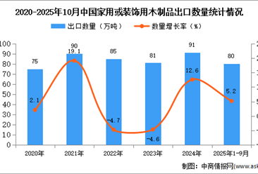 中商情报网讯:据中商产业研究院数据库显示,2024年我国家用或装饰用木制品出口量91万吨,同比增长12.6%。最新数据显示,2025年1-10月中国家用或装饰用木制品出口量80万吨...【详情】
