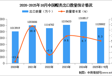 中商情报网讯:据中商产业研究院数据库显示,2024年我国帽类出口量1318517万个,同比增长8.7%。最新数据显示,2025年1-10月中国帽类出口量1128802万个,同比增长5.3%。 ...【详情】
