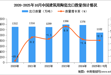 中商情报网讯:据中商产业研究院数据库显示,2024年我国建筑用陶瓷出口量1376万吨,同比下降1.4%。最新数据显示,2025年1-10月中国建筑用陶瓷出口量1102万吨,同比下降2.3...【详情】