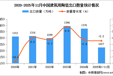 中商情报网讯:据中商产业研究院数据库显示,2024年我国建筑用陶瓷出口量1376万吨,同比下降1.4%。最新数据显示,2025年1-11月中国建筑用陶瓷出口量1227万吨,同比下降2.2...【详情】
