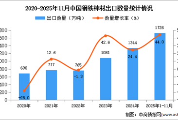 中商情报网讯:据中商产业研究院数据库显示,2024年中国钢铁棒材出口量1344万吨,同比增长24.4%。最新数据显示,2025年1-11月中国钢铁棒材出口量1726万吨,同比增长44%。 ...【详情】