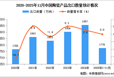 中商情报网讯:据中商产业研究院数据库显示,2024年我国陶瓷产品出口量1957万吨,同比增长2.8%。最新数据显示,2025年1-11月中国陶瓷产品出口量1776万吨,同比增长持平。 ...【详情】
