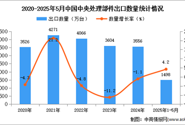 中商情报网讯:据中商产业研究院数据库显示,2024年中国中央处理部件出口量3556万台,同比下降1.1%。最新数据显示,2025年1-5月中国中央处理部件出口量1498万台,同比增长...【详情】
