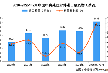 中商情报网讯:据中商产业研究院数据库显示,2024年中国中央处理部件进口量1400万台,同比下降2.5%。最新数据显示,2025年1-7月中国中央处理部件进口量1838万台,同比增长...【详情】