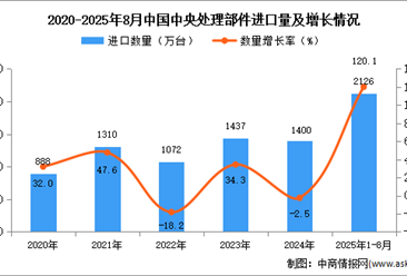 中商情报网讯:据中商产业研究院数据库显示,2024年中国中央处理部件进口量1400万台,同比下降2.5%。最新数据显示,2025年1-8月中国中央处理部件进口量2126万台,同比增长...【详情】