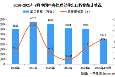 中商情报网讯:据中商产业研究院数据库显示,2024年中国中央处理部件出口量3556万台,同比下降1.1%。最新数据显示,2025年1-8月中国中央处理部件出口量2543万台,同比增长...【详情】