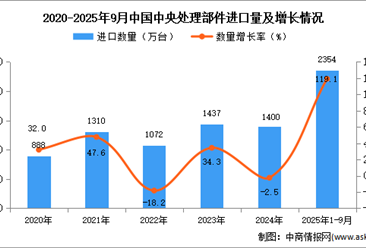 中商情报网讯:据中商产业研究院数据库显示,2024年中国中央处理部件进口量1400万台,同比下降2.5%。最新数据显示,2025年1-9月中国中央处理部件进口量2354万台,同比增长...【详情】