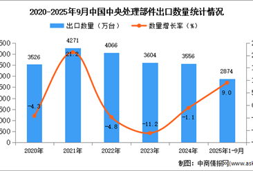 中商情报网讯:据中商产业研究院数据库显示,2024年中国中央处理部件出口量3556万台,同比下降1.1%。最新数据显示,2025年1-9月中国中央处理部件出口量2874万台,同比增长...【详情】