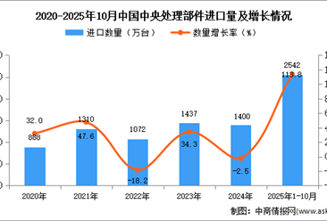 中商情报网讯:据中商产业研究院数据库显示,2024年中国中央处理部件进口量1400万台,同比下降2.5%。最新数据显示,2025年1-10月中国中央处理部件进口量2542万台,同比增...【详情】