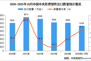 中商情报网讯:据中商产业研究院数据库显示,2024年中国中央处理部件出口量3556万台,同比下降1.1%。最新数据显示,2025年1-10月中国中央处理部件出口量3164万台,同比增...【详情】