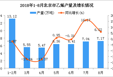 中商情报网讯:据中商产业研究院数据库显示,2018年3-4月北京市乙烯产量有小幅度下降,2018年4-8月北京市乙烯产量呈增长趋势;2018年8月北京市乙烯产量为7.17万吨,同比增...【详情】