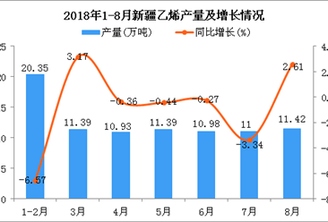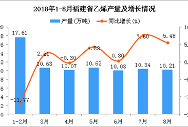 中商情报网讯:据中商产业研究院数据库显示,2018年3-7月新疆乙烯产量呈小幅度波动状态,整体有小幅度下降;2018年7月新疆乙烯产量为11万吨,同比下降3.34%。2018年8月新...【详情】