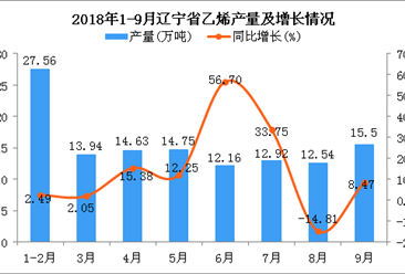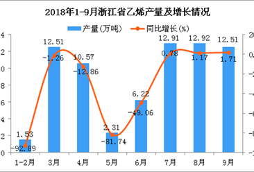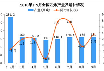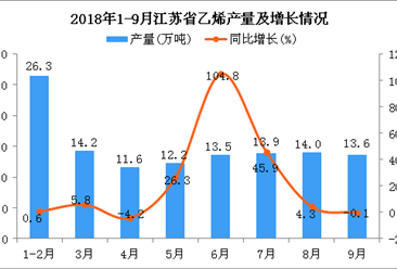 中商情报网讯:据中商产业研究院数据库显示,2018年4-8月江苏省乙烯产量呈小幅度增长,2018年9月江苏省乙烯产量有小幅度回落;2018年9月江苏省乙烯产量为13.6万吨,同比下...【详情】