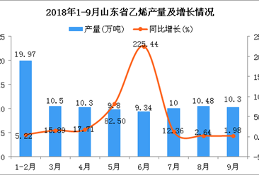 中商情报网讯:据中商产业研究院数据库显示,2018年3-6月山东省乙烯产量下降,2018年6月山东省乙烯产量为9.34万吨,同比增长225.44%。2018年7-9月山东省乙烯产量有所回升...【详情】