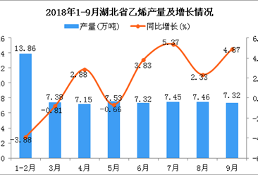 中商情报网讯:据中商产业研究院数据库显示,2018年3-9月湖北省乙烯产量呈小幅度波动状态,整体有小幅度下降;2018年9月湖北省乙烯产量为7.32万吨,同比增长4.87%。2018年...【详情】