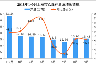 中商情报网讯:据中商产业研究院数据库显示,2018年3-7月上海市乙烯产量连续4个月下降,2018年8月上海市乙烯产量有些许回暖,2018年9月上海市乙烯产量再次下降;2018年9月...【详情】