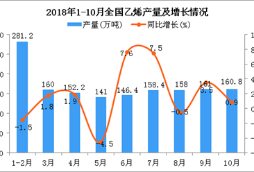 中商情报网讯:据中商产业研究院数据库显示,2018年5-10月全国乙烯产量整体呈增长趋势,2018年10月全国乙烯产量有小幅度回落;2018年10月全国乙烯产量为160.8万吨,同比增...【详情】