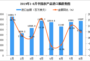 中商情报网讯:据中商产业研究院数据库显示,2019年1-2季度中国农产品进口金额有所增长,2019年8月中国农产品进口金额为13297百万美元,同比增长4.7%。 数据来源:中商...【详情】