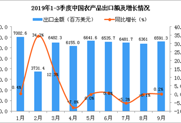中商情报网讯:据中商产业研究院数据库显示,2019年1-3季度中国农产品出口金额有所增长,增长12.88%。2019年9月中国农产品出口金额为6591.3百万美元,同比增长0.2%。 数...【详情】