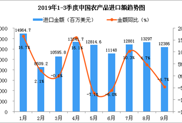 中商情报网讯:据中商产业研究院数据库显示,2019年1-3季度中国农产品进口金额有所增长,增长13.19%。2019年9月中国农产品进口金额为12386百万美元,同比下降4.7%。 数...【详情】