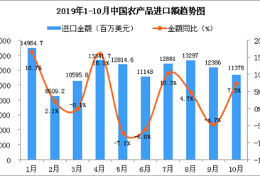 中商情报网讯:据中商产业研究院数据库显示,2019年1-3季度中国农产品进口金额有所增长,增长13.19%。2019年10月中国农产品进口金额为11376百万美元,同比增长7.3%。 数...【详情】