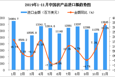中商情报网讯:据中商产业研究院数据库显示,2019年1-3季度中国农产品进口金额有所增长,增长13.19%。2019年11月中国农产品进口金额为13645百万美元,同比增长33.2%。 ...【详情】