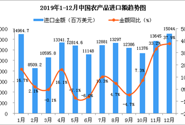 中商情报网讯:据中商产业研究院数据库显示,2019年1-3季度中国农产品进口金额有所增长,增长13.19%。2019年12月中国农产品进口金额为15044百万美元,同比增长37.9%。 ...【详情】