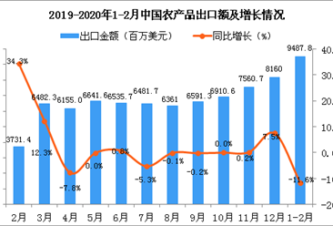 中商情报网讯:据中商产业研究院数据库显示,2020年1-2月中国农产品出口金额有小幅度下降,2020年1-2月中国农产品出口金额为9487.8百万美元,同比下降11.6%。 数据来源...【详情】