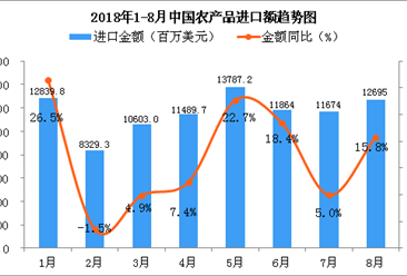 中商情报网讯:据中商产业研究院数据库显示,2018年2月-5月我国农产品进口金额呈上升趋势,2018年5月我国农产品进口金额为13797.2百万美元,同比增长17.3%。2018年5月-7月...【详情】
