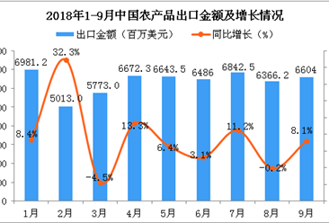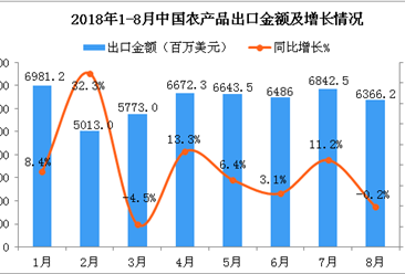 中商情报网讯:据中商产业研究院数据库显示,2018年2-4月中国农产品出口金额逐渐增长,2018年4月中国农产品出口金额为6672.3百万美元,同比增长13.3%。2018年5-6月中国农...【详情】