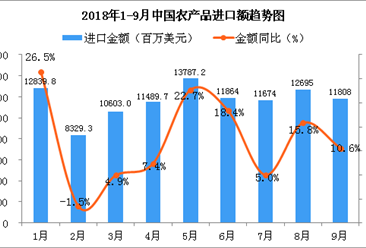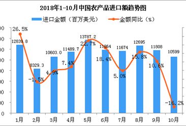 中商情报网讯:据中商产业研究院数据库显示,2018年8-10月中国农产品进口金额逐渐下降,2018年10月中国农产品进口金额为10599百万美元,同比下降16.2%。 数据来源:中商...【详情】