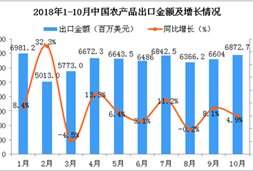 中商情报网讯:据中商产业研究院数据库显示,2018年8-10月中国农产品出口金额呈小幅度增长趋势,2018年10月中国农产品出口金额为6872.7百万美元,同比增长4.9%。 数据来...【详情】
