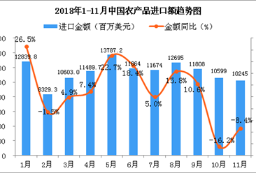 中商情报网讯:据中商产业研究院数据库显示,2018年8-11月中国农产品进口金额逐渐下降,下降幅度有所减缓;2018年11月中国农产品进口金额为10245百万美元,同比下降8.4%。...【详情】