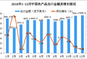 中商情报网讯:据中商产业研究院数据库显示,2018年8-11月中国农产品出口金额逐渐增长,2018年11月中国农产品出口金额维持增长趋势;2018年11月中国农产品出口金额为7542....【详情】