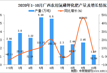 中商情报网讯:据中商产业研究院数据库显示,2020年10月广西农用氮磷钾化肥产量为52.56万吨,同比增长1.19%。 数据来源:中商产业研究院数据库 2020年10月广西农用氮磷...【详情】
