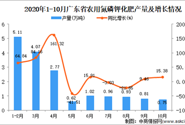 中商情报网讯:据中商产业研究院数据库显示,2020年10月广东省农用氮磷钾化肥产量为0.75万吨,同比增长15.38%。 数据来源:中商产业研究院数据库 2020年10月广东省农用...【详情】